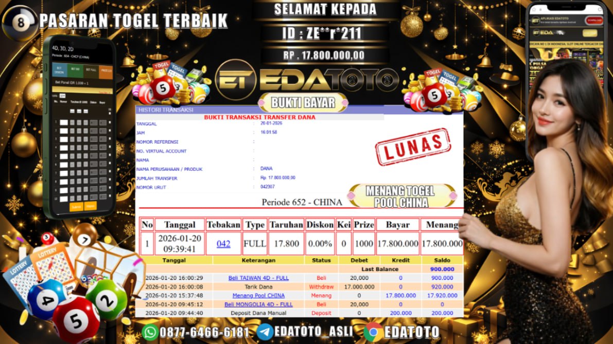 Selamat Kepada Pemilik user ID : ZE**e*211 Hari/Tanggal :selasa/ 20, Januari 2026 Jackpot : Rp. 17,800,000 JT Withdraw : 17,800,000 . . .