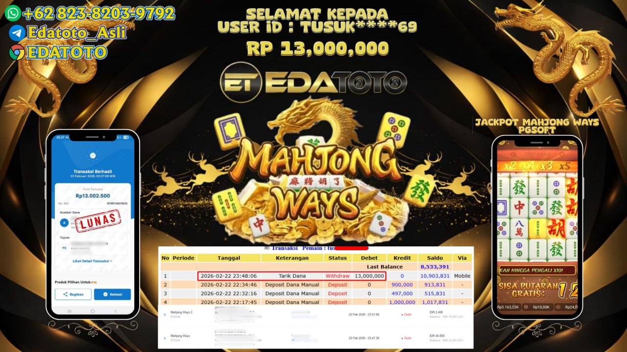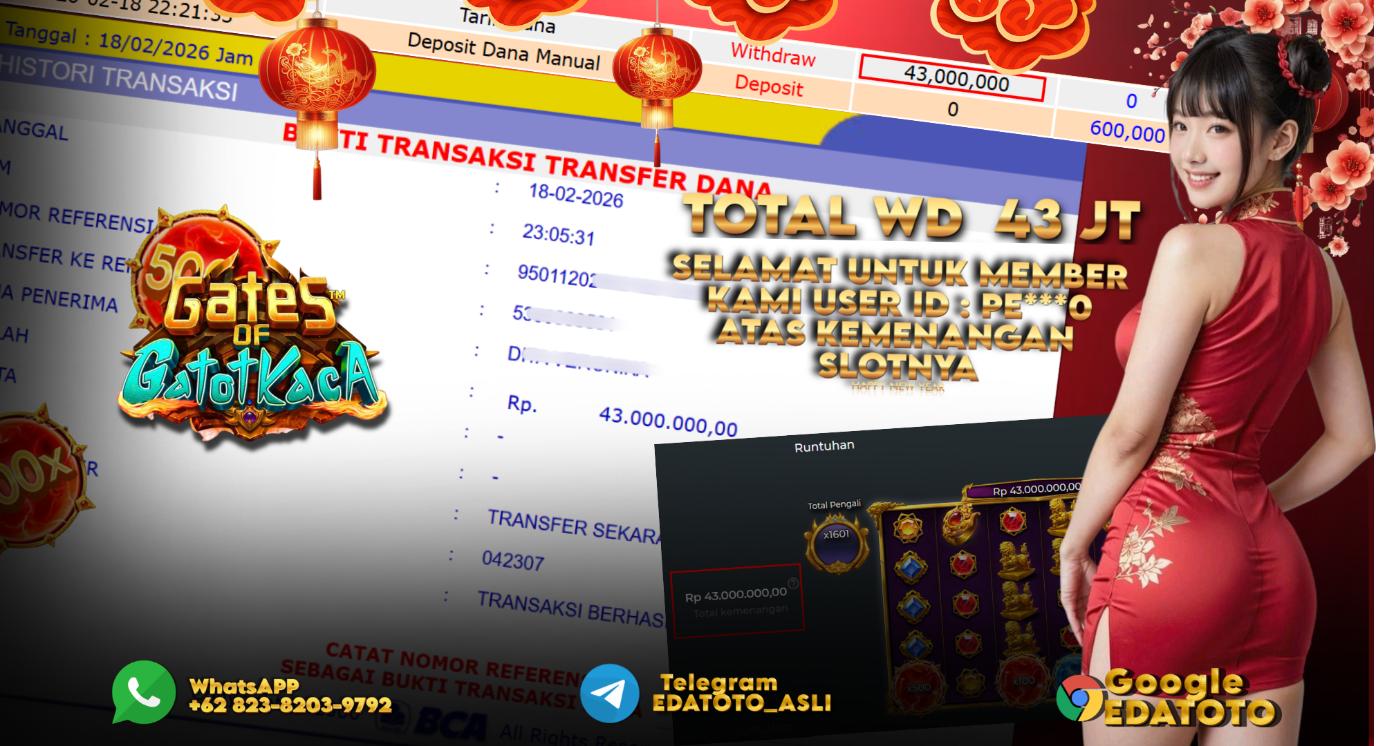 Selamat Kepada Pemilik user ID : PE***0 Hari/Tanggal : Rabu/ 18 februari 2026 Jackpot : Rp, 43,000,000 JT Withdraw : . . .