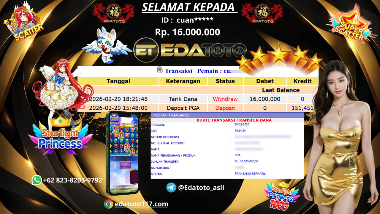 Selamat Kepada Pemilik user ID : Cuan***** Hari/Tanggal : Kamis / 20 februari 2026 Jackpot : Rp, 17,972,000 JT Withdraw . . .